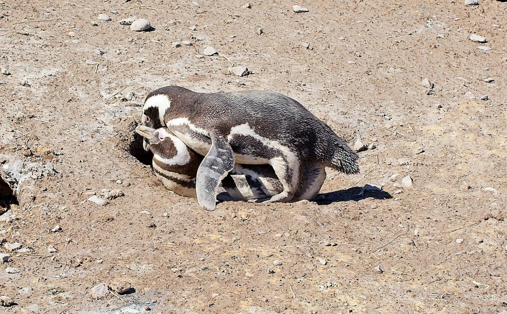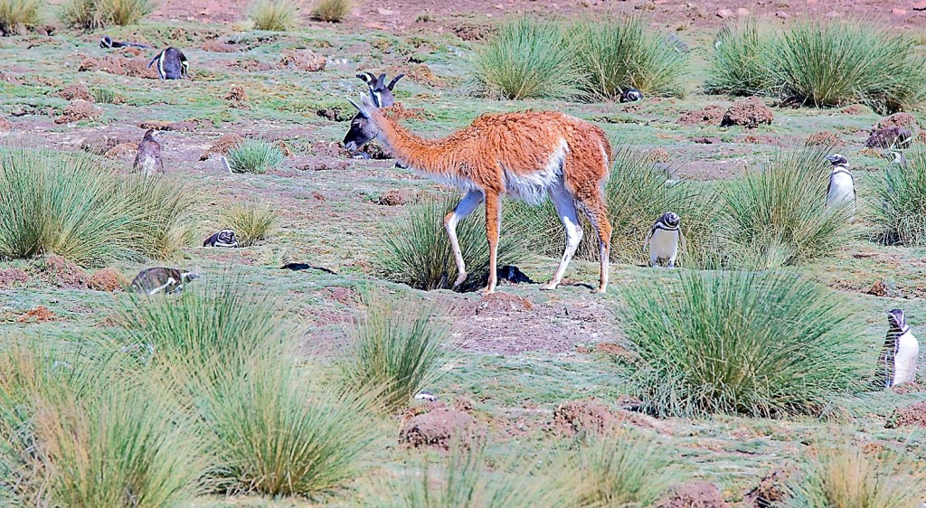 The night before, we had come to the guard house and almost blew right by it before the dude flagged us down and informed us we couldn’t camp out there. So when we came traipsing by on foot, he was a bit surprised……and disappointed, because he had to charge us 10 pesos less. We walked the 3 km on the dirt road out to the penguin colony. There was no one else there. It was pretty cool. There was a trail/boardwalk that took you right down to the penguins. They were maybe 4” away from you. The guanacos were grazing right along with the penguins. The babies were all molting and looked pretty funny.