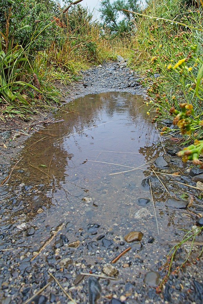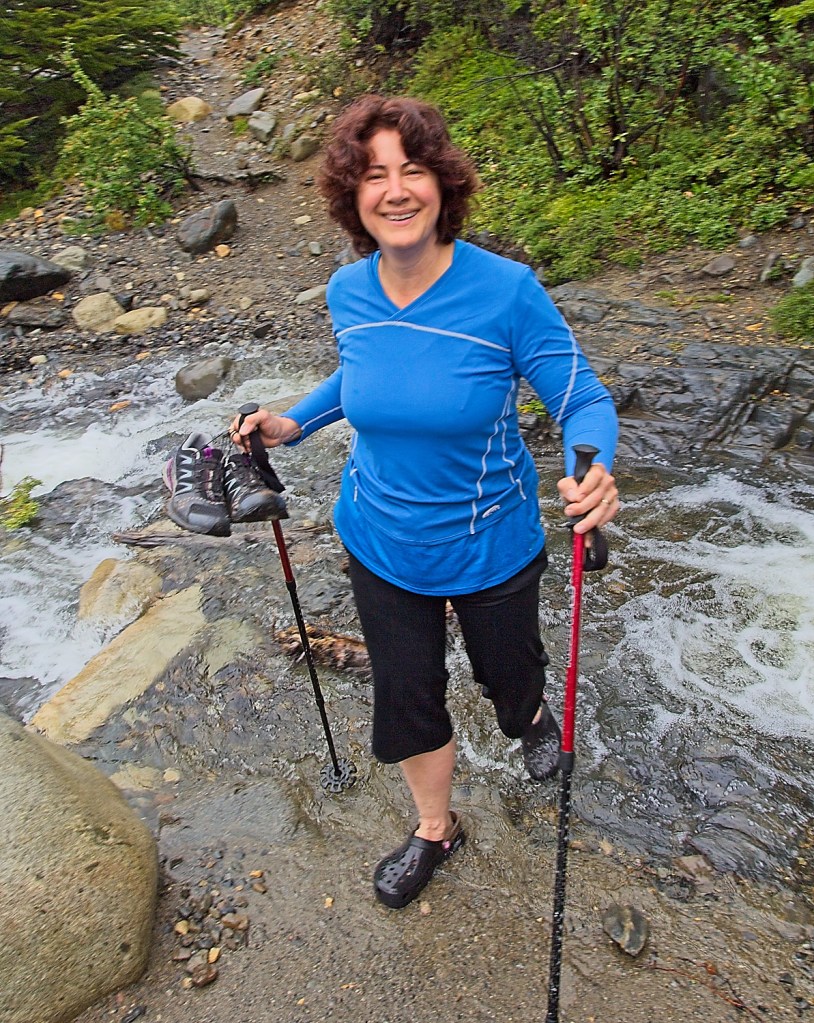 There were a number of creek crossing on this trail the required a fair amount of skill to get across if you didn’t want to get soaked to a squishy (that’s a technical New Zealand term for wet). To Susanne’s great delight, she had smartly packed her crocs. Now, I know, this is a much-maligned shoe company. How on dog’s green earth can a shoe company that makes modeled plastic “shoes” be worth a billion dollars. Well, here is how. At each tricky creek crossing, I would carefully, with years and years of experience, make my way delicately across the rocks; always in danger of dousing my expensive camera (which by the way, Greg, does a crappy job of making a gray sky, with a gray background with a gray colored lake, look interesting) in the creek. However, Susanne, being the smarter of the two of us, would simply, stop, take off her shoes, put on her crocs, and march across the creek. It was brilliant. So, if you are ever wondering why crocs are awesome, call Susanne.