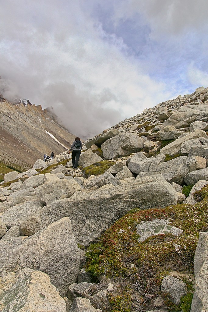 The weather was holding, but the tops of the Towers were clouded in. We kept climbing. It was pretty steep and hard effort for Susanne, but she settled down to a pace she could maintain. We got to the cut-off for the secret trail. It was a pretty good boulder field to cross. I was worried about both Susanne’s happiness and safety crossing the rocks. I asked Gonzalo how far it was across the boulders. “2 minutes.” I almost said no, we’d just go up to the lagoon. I probably should have. It was a big challenge for Susanne and this other woman Cheryl. I hung back with them to make sure they were ok. Annoyingly, Gonzalo sprinted off with everyone else. After a 20 minutes scramble we got to a creek bed that was much easier walking. Gonzalo asked Susanne how she liked the climb across the rocks. She said “I didn’t love it.” I wanted to warn him that he was about to receive a dose of the not so pleasant Spanish if he wasn’t a better guide.