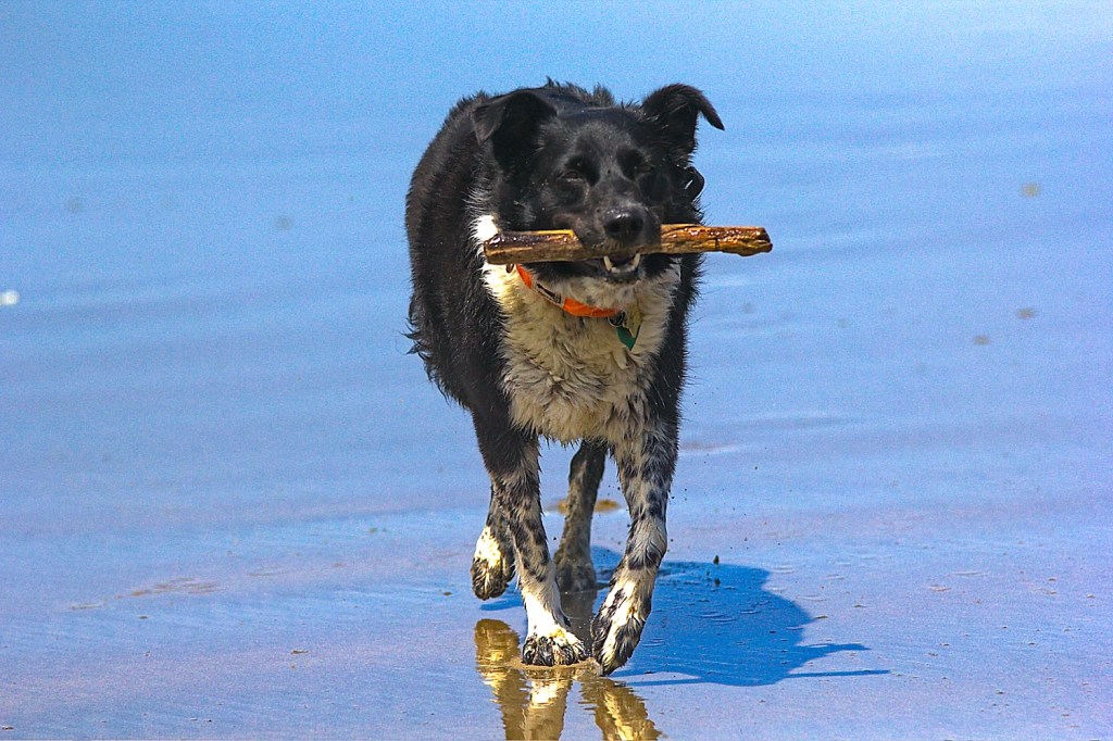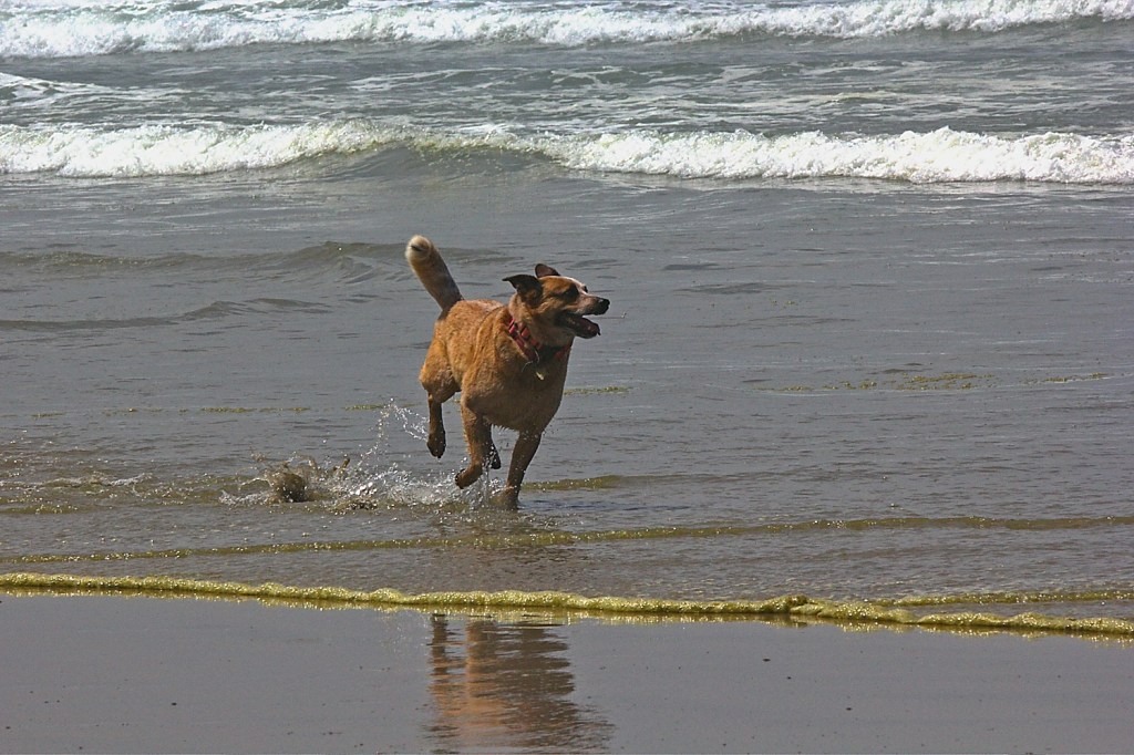 Well, the crow being a crow and being way smarter than any stupid cattle dog, lifts up in the air and starts flying around Ringo and taunting him. Ringo gets apoplectic! How could a dumb bird do this to me! So he is totally focused on the crow hovering over his head squawking at him and not paying attention to the ocean when a big ole wave rolls in and hits Ringo, knocks him off his feet and washing machines him. He was shocked.
