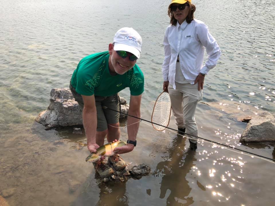 I moved down to a jut of rocks and started fishing there. I saw a couple swim by. Then BAM! I got one. A really nice cutthroat trout. It took awhile for us to get him in and get in position for a picture, so I was worried for the fish’s safety — hence the worried look on my face.