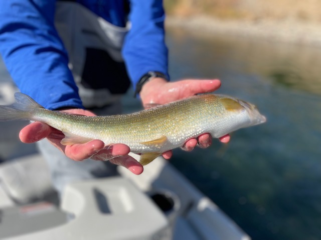 We piled back into the boat and continued down the river fishing. I caught a number of other cuttys and lost a couple good sized rainbows. At one point I got a big one on and started to work it toward the boat. It just dove down to the bottom and hunkered down there. I almost thought that I had imagined that I had a fish on and I was actually snagged on the bottom. Nope, the guy started fighting again and I managed to bring him in. A hefty whitefish. They are very carp looking and put up a surprisingly good fight. It was the first white fish I had ever caught.