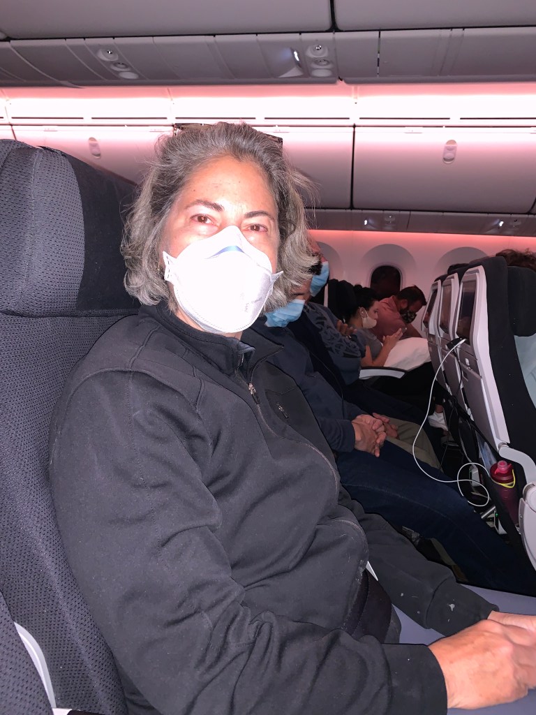 We had some food and some wine and finally it was time to board. I thought the flight was going to be empty, but it was chockerblock full. Bummer. But at least we had our skycouch row. We got settled in and the flight attendant showed us how to use the couch. He was very chatty and was excited to hear that we were trying to move to New Zealand. He told us all the great places that he liked. He loved the Nelson area, especially Golden Bay. The thought of having to wear a mask for 13 hours was less than appealing, but I was not going to complain.