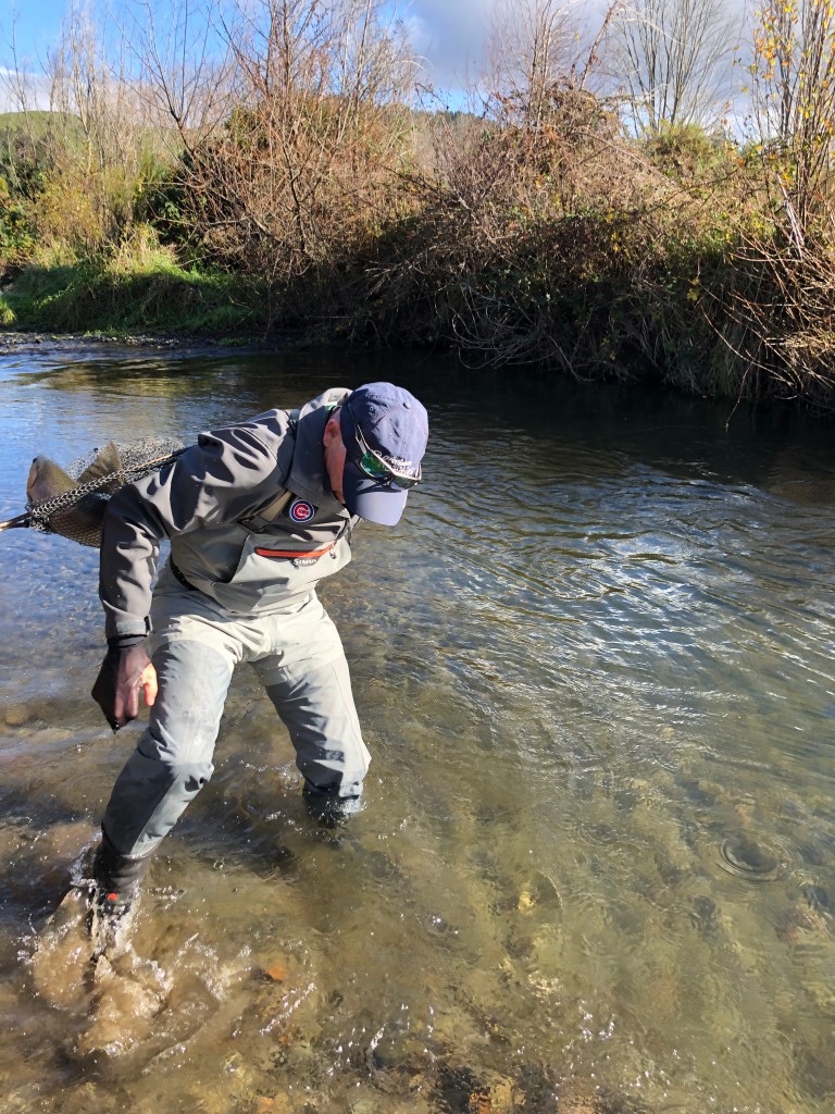 The fish are impressively large in this part of New Zealand.Bryce was telling me that we were here a bit early for the spawning run. I asked about how many fish would be in the hole and he said about 12 to 15 at the moment, but when the spawning run really got going there would be upwards of 150. Wow! On good day, you can catch 30 or 40 fish easily. I was happy with just one to be honest.