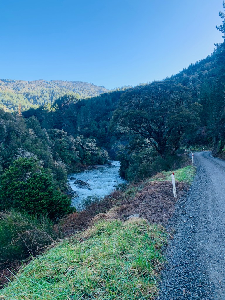 We had our coffee and I prepped all the gear necessary, including my spiffy Garmin In-reach to allow me send texts to Susanne and let her know I had not managed to ride off a cliff. We headed out and the day was amazing. The view of the Kahurangi Range was incredible as we drove toward Woodstock (see cover photo). We got to Woodstock, but it wasn’t clear where the trail started so we headed up the road. Pretty soon it became clear that we had missed it, so we headed back. Finally we found it. It was chilly, but not too bad. I reconfirmed my plan with Susanne and headed out up the road.