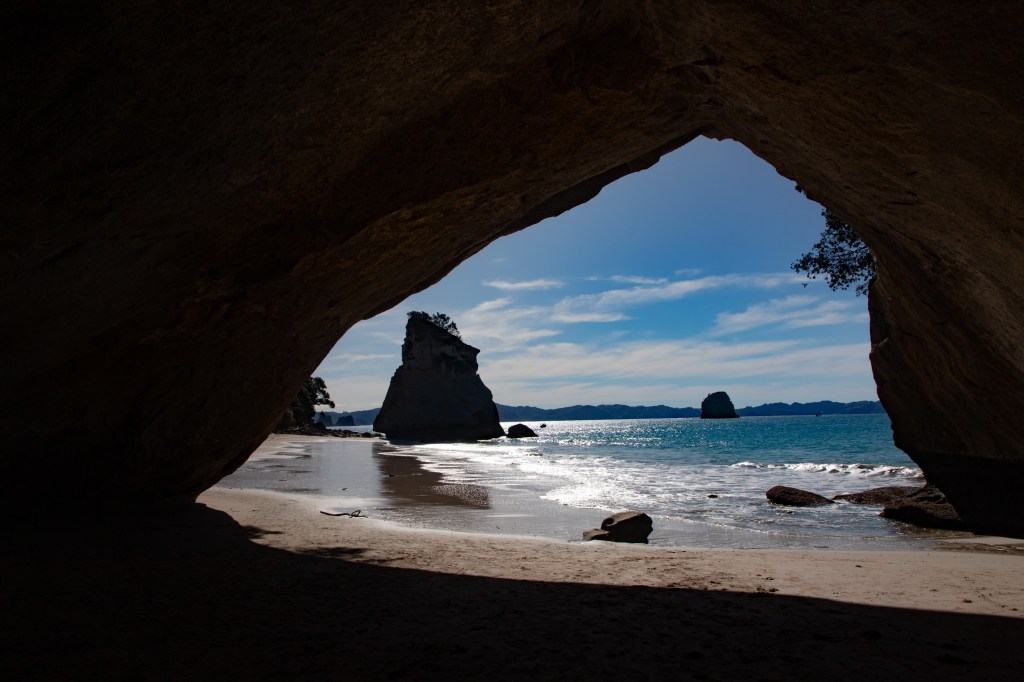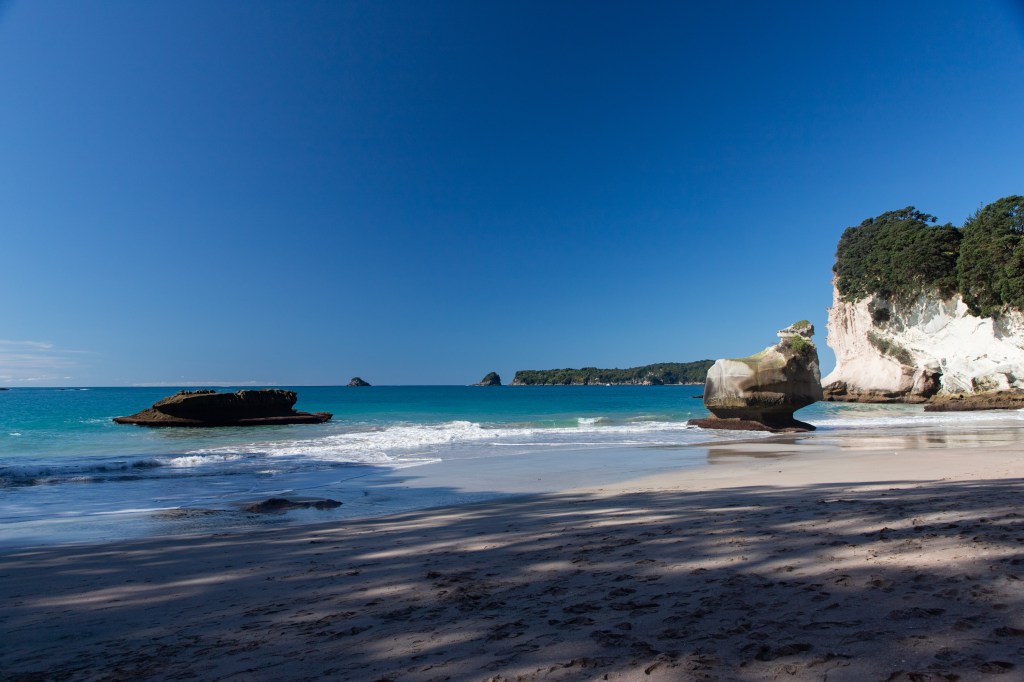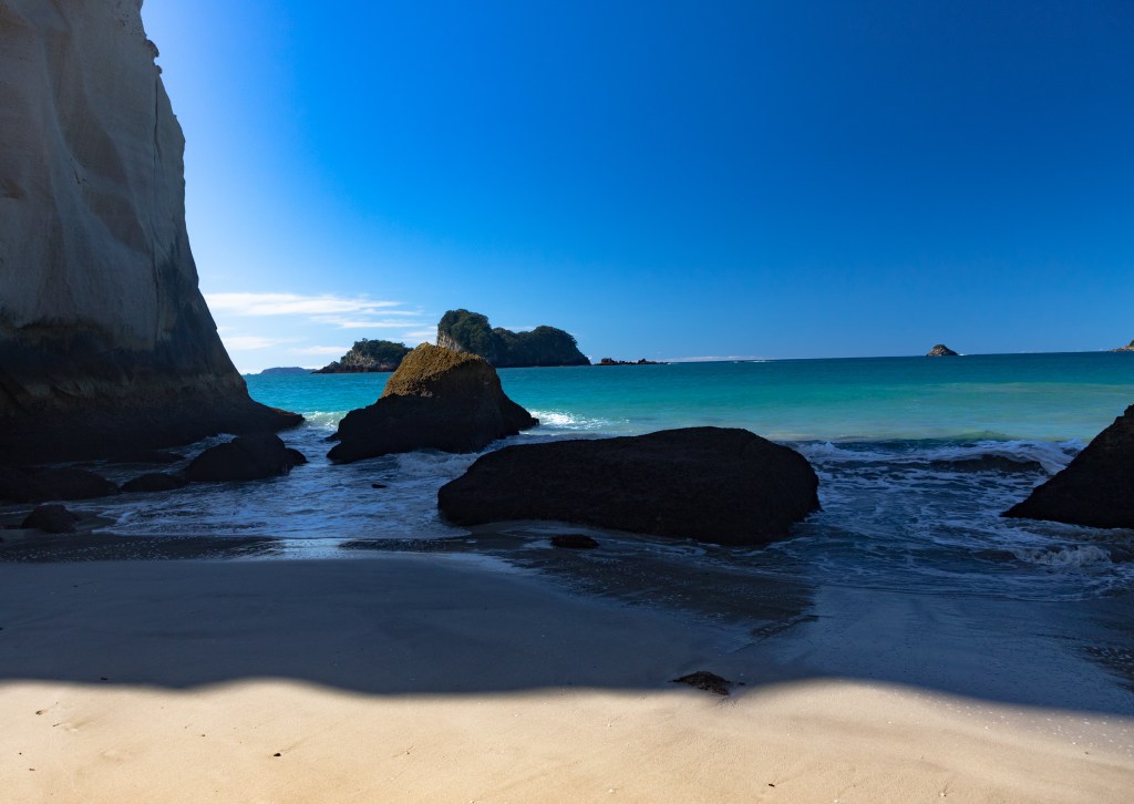 We stopped in Tairua and did a bit of walking on the beach to check it out and stretch the legs. It was a lovely town with a lot of very nice houses that were definitely way more than a typical “bach.” This area is mostly holiday homes from folks coming from Auckland which is a 2 to 2.5 hour drive away. Anne, our Cooks Beach host, had told us about a good butcher shop there, so we stopped in and bought a few supplies to take with us and stick in the freezer. There is no “real” store close to Cooks Beach. The nearest New World or Countdown is about a 40 minute drive. Ironically, it is only about 5 kms away, but it is across an estuary that doesn’t have a car bridge. You could take the ferry, but then it would be a 2 km walk to the store on the other side. Bummer.