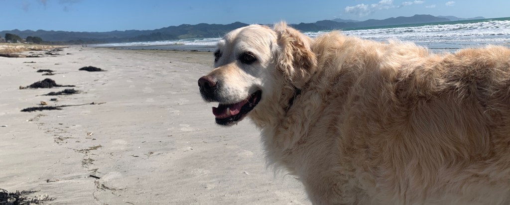 The rain finally abated and we had a clear day in the forecast, so we decided to take a drive up north to Kūaotunu and Matarangi. Anne had told us there was a nice restaurant up there. We decided we would take Romy for a road trip since we would be gone for a while. The road was—surprise!—narrow and windy for parts of it. Romy did not seem to appreciate this and started whining. Susanne did not appreciate it either, but she did not start whining, though I’m sure there was some passenger-side braking going on. We got to Kūaotunu and went for a walk on the beach. Romy was happy to get out of the car. We decided to drive further down the road to Matarangi and check that beach out. It was lovely and a great walking beach, with some absolutely beautiful houses there.