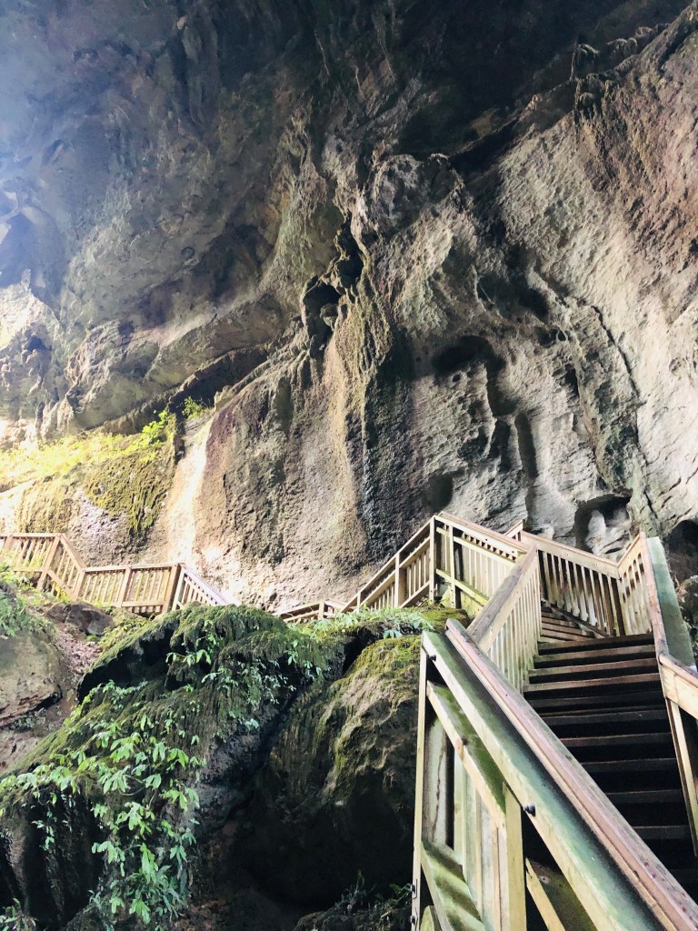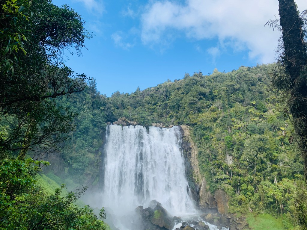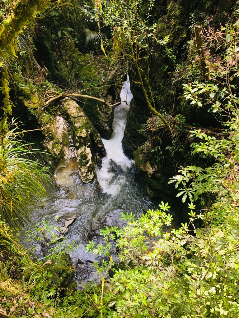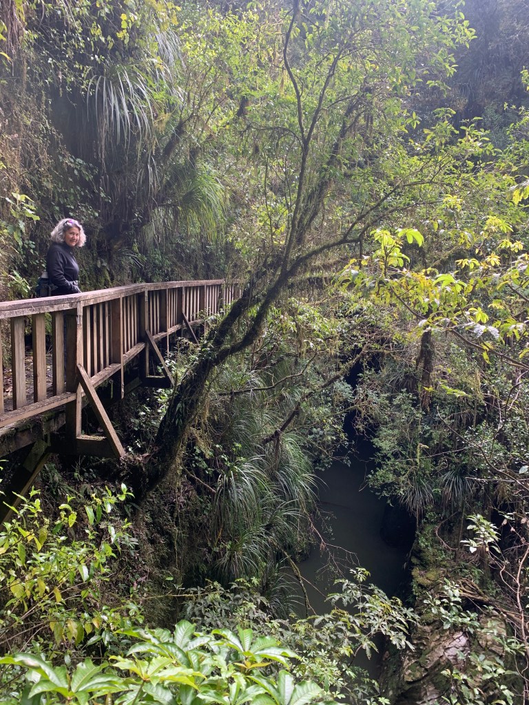I had scoped out another cave, Piripiri, that you could go check out by yourself and for free, not too far away, so we decided to take a drive west on Te Anga Road to where the cave was. It was a gorgeous drive and would make a great bike ride as there was not much traffic on it. We got to the cave parking and walked up to and into the cave. It was a bit underwhelming. No real formations, just a set of wood stairs that descended into a small cavern. Oh well. On the way out, we encountered Toni, who was with a mobile car air conditioning company, heading into the cave. We chatted for a while and he told us that we should go down the Marokopa falls just down the road. “It’s worth the stop” he told us.