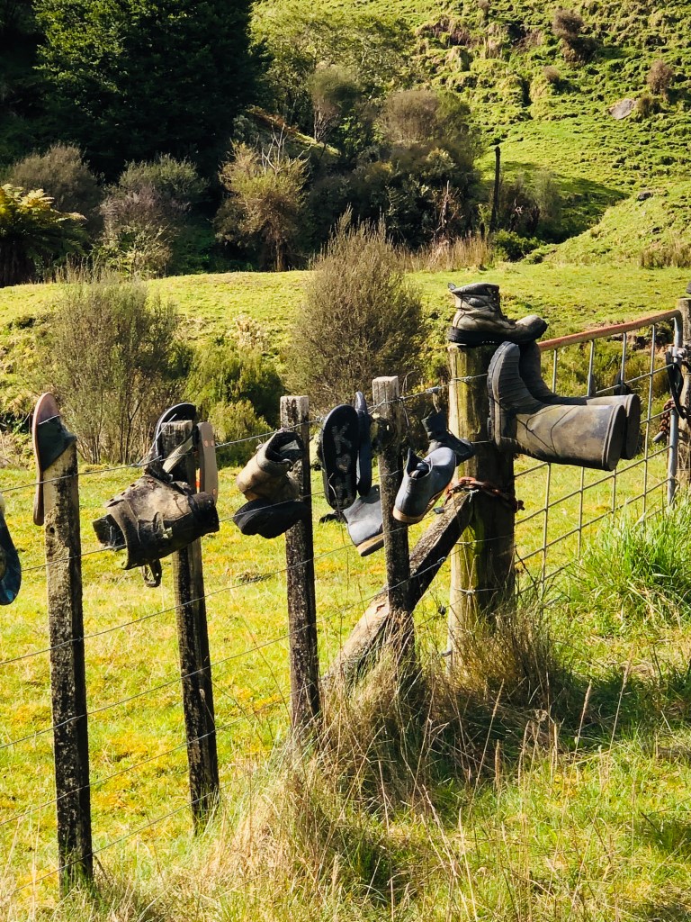 We decided to drive in to Waitomo and have an early dinner (=linner) and then just have a snack later so that I could have some wine and not be driving on a narrow windy road. Along the way, at the end of some tramping track there was a fence in which people had attached their boots. I guess it was a sign that the tramp was done and their shoes were worn out or something. It was kind of funny. Huhu cafe was open so we went there. We had some fish and chips and they were quite good…probably the best that we have had so far in New Zealand.