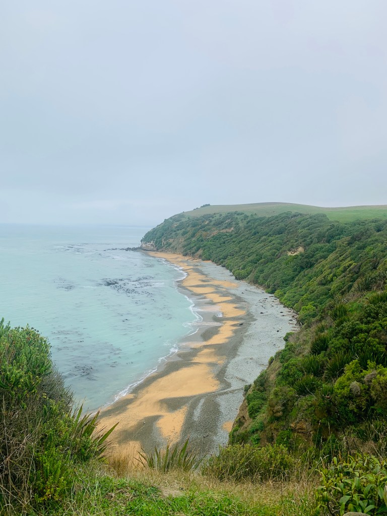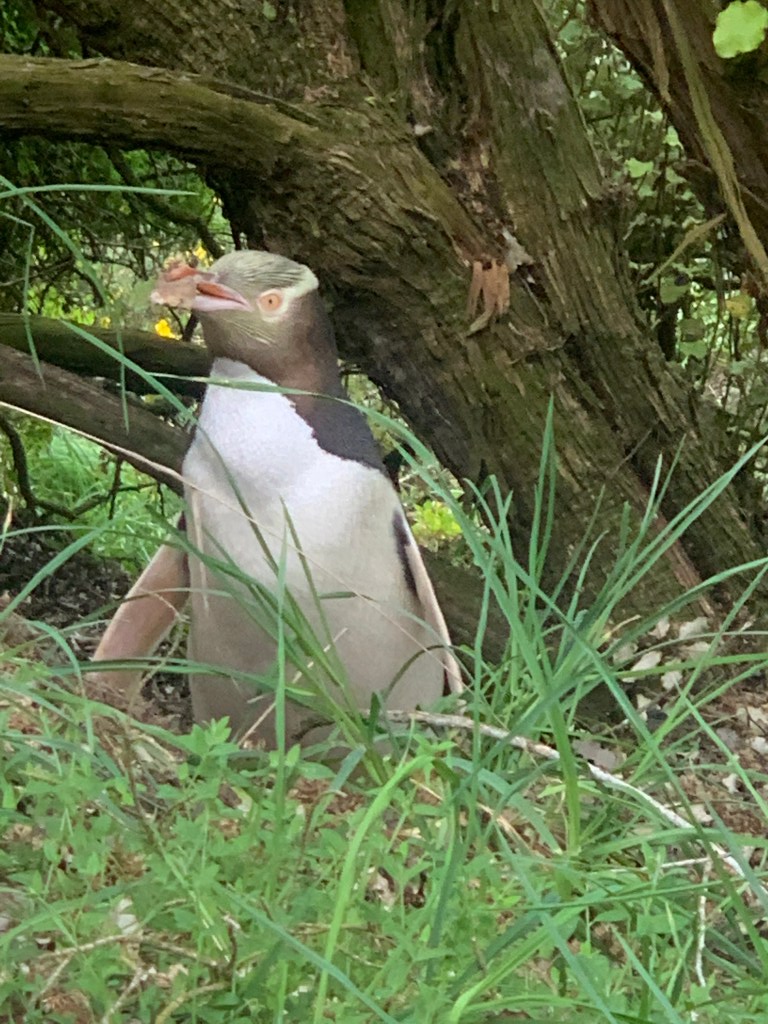 The house seems to be brand new and is super comfy and well insulated. It is a 2-1 bach that is perfect for two people. We unpacked, settled in, and enjoyed the view. The next morning we decided to walk down to the beach after some coffee to just check it out. I decided to not bring my good camera as I was not expecting to see any penguins at that hour. It is not a big beach, but very scenic. We checked it out from the penguin viewing area and then headed down toward the beach. A family ahead of us was stopped on the trail. They whispered “there’s a penguin!” Sure enough! There was one standing right next to trail with some leaves and twigs in its beak! Usually you only see them from a distance because they are very skittish creatures, but we all got a good look at this one. They are huge! Over 2 feet tall. Amazing.
