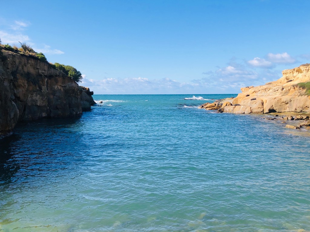 The weather, albeit windy and cold, was holding for us and neither of us felt like heading back yet, so we looked on the map and found a reserve (Tavora) just south of us that we knew nothing about. We thought, why not? The drive is was incredibly scenic through pasture lands, rolling hills, and stunning views of the ocean. There was one other car there when we showed up. The sign indicated that it was a short walk to the beach and that there was another longer loop around the headland. I thought it was going to be relatively miserable and we would only go to the beach, so I left my good camera behind.