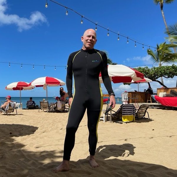 Sadly, I forgot to log on to the Hanauma Bay reservation system in time and got totally shut out for the one day we could do it. Bummer. We decided to go down to the Outrigger Canoe Club where Peter has been a member since the early Triassic. There is a nice private beach and it’s a great place to go for an open water swim. In order to not get turned into a lobster, I put on my nifty “stinger suite” to swim in. I guess all the surfers in Australia wear them to help prevent jellyfish stings.