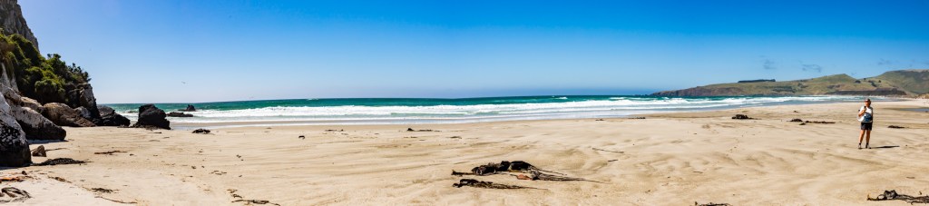 Blackhead Surfing Beach: One morning we decided to change up our routine and headed down to a beach near Brighton. As we were walking out toward the beach, a dude stopped us and told us to be careful as there was a huge elephant seal right by the trail where it went to the beach. We put Emmitt on leash and proceeded with caution. We saw the seal napping there and carefully squeezed by him and quickly put some distance between us. It was a lovely beach and highlighted how you can see amazing sea life here almost everywhere!