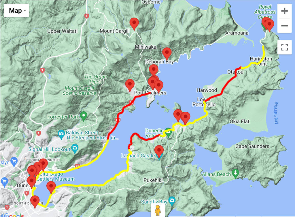 I did not do the full loop, but rode the section from Dunedin to just short of the Albatross colony. It is about 36 km out and back and is pretty much flat as a pancake. Each time I rode it, there was a 30 knot headwind out. It was brutal. The good news was that it was a piece-o-cake back.