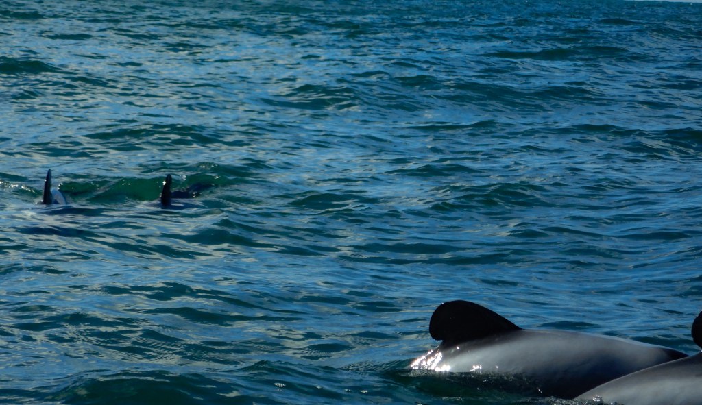 We saw some molting blue penguins and fur seals. Neato! The whole bay is gorgeous. We got out near the mouth of the bay where you have a chance to see Hector’s dolphins and sure enough about 5 of them swam right by us. I guess they are the smallest dolphins in the world and they are endemic to New Zealand. The fur seals had just had their pups so there we a bunch of very tiny, very cute babies hanging out on the rocks. We circled the bay and headed back to the beach. It wasn’t much of a work out, but the scenery was definitely worth the effort.