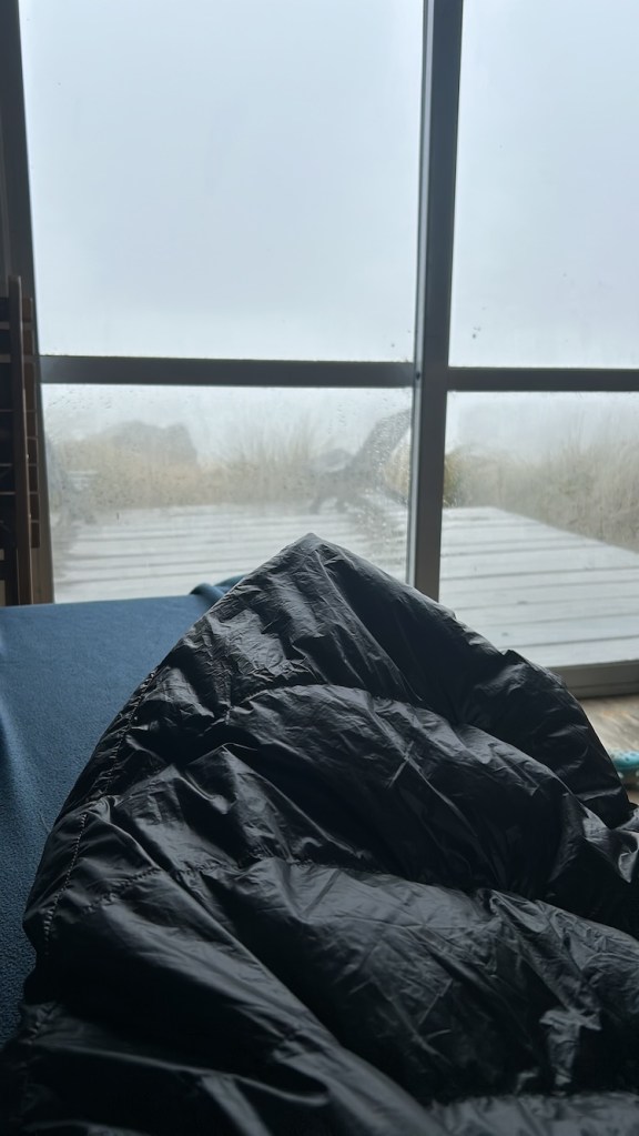 The hut was cold, so I piled into the sleeping bag and read my book. I was thankful for the Murphy bed because it gave me a comfortable place to hang out while I watched the stormy weather outside.