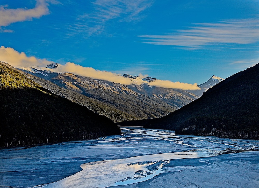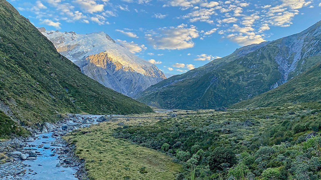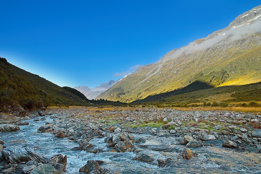 The hike up the first part of the valley is pretty easy going, at least in terms of the Rees Dart track. As the sun was came up, the lighting on the mountains and glaciers kept changing, giving us different views. Although it was a little chilly, you could tell it was going to be a pretty warm day by the time the sun got fully cooking.