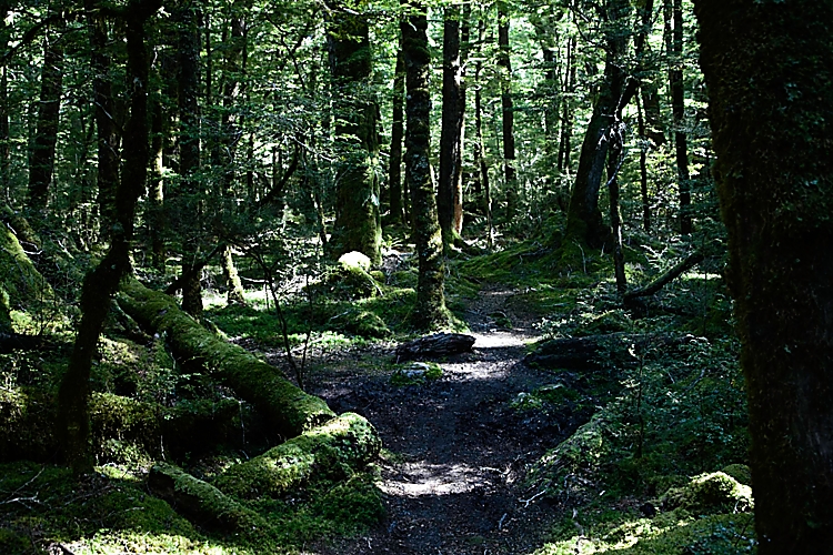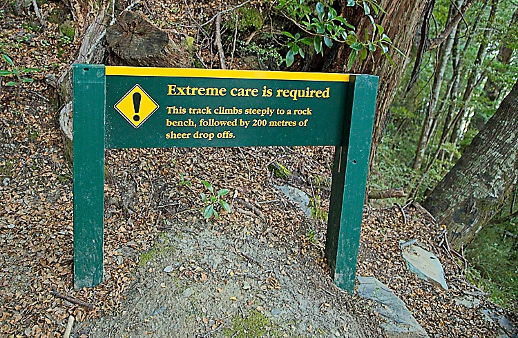The DOC brochure had warned that you should have “substantial tramping experience” if you are going to do this section. That seemed over the top after everything we had already traversed without warning. The first part of it wasn’t bad and Bev and I were thinking the reroute wasn’t going to be an issue. Then the root ladders and boulders showed up. Up, down, up, down, up, down, up, down. Even the well-tuned British Race Car was starting to complain. I just hoped the whole hike wasn’t going to be more than 16 km. We were again plodding along at maybe 1 km per hour. Ugh.