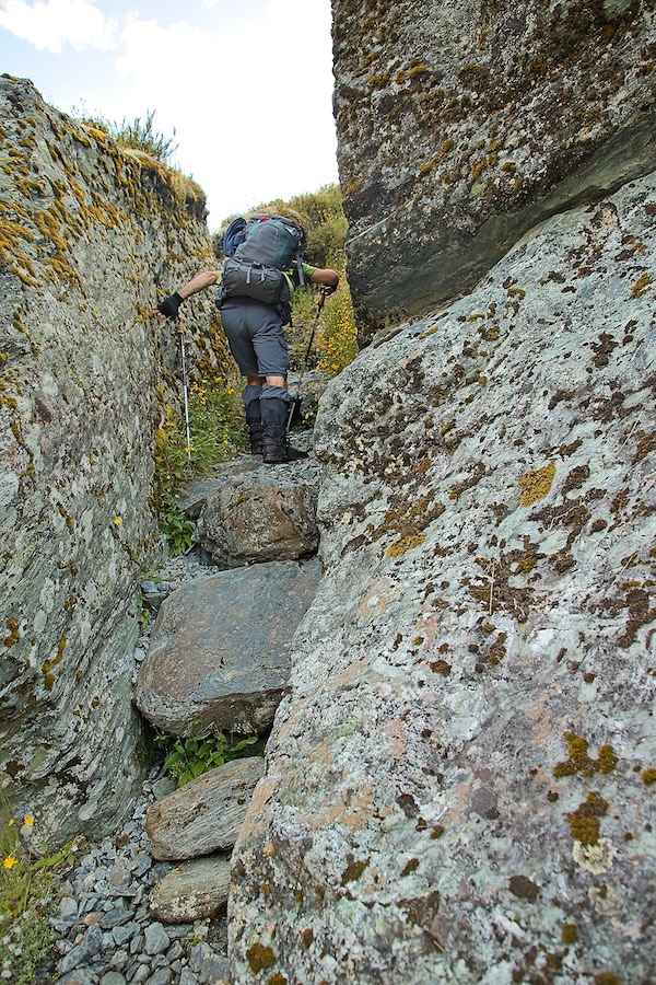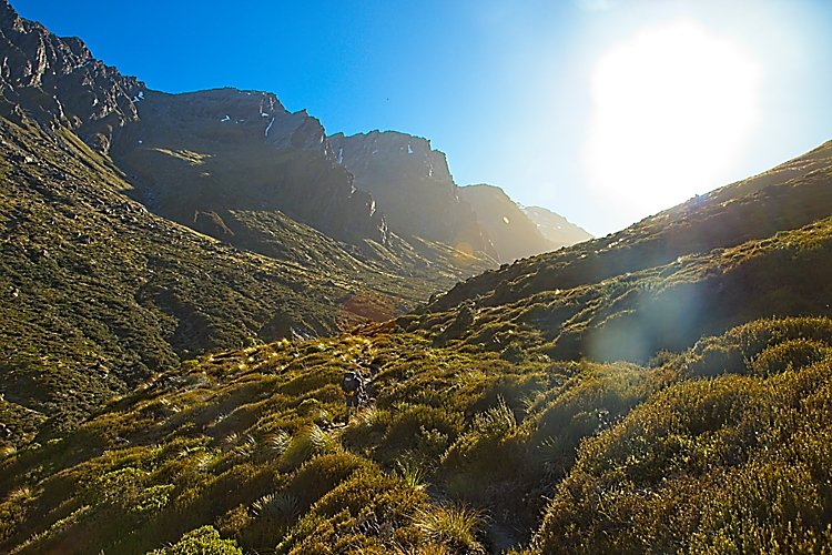 The one problem with bright blue skies is that is makes for lousy photography. Everything just gets washed out and oversaturated. I was hoping for some partly cloudy days like I got on the Kepler Track in order to get some good photos. The constant shooting into the sun was a bit frustrating as well and made me question the sanity of lugging around a 2 kg camera as I scrambled up and down boulders.