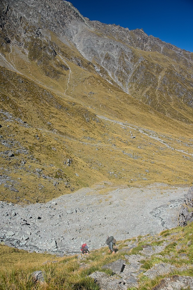 The views on the saddle were crazy. The other amazing thing was that there was no wind at all. On one side you looked straight over at the Dart Glacier and on the other you looked over a sheer cliff into the Matukituki valley which eventually ends in Wanaka. There was also a big cascade pouring over the cliff. It still left me wondering how it got the name Cascade Saddle, though.