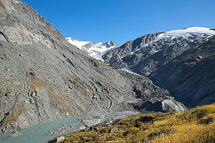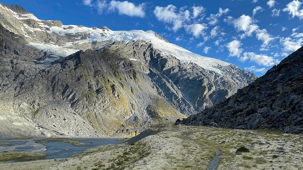 Finally, you turn up and start the steep climb to Cascade Saddle. You get a great view of the Dart Glacier on the way up, but I will say the bottom of a glacier is really not all that appealing-looking—a big pile of mud and rocks with the occasional piece of ice sticking out. But it is cool nonetheless.
