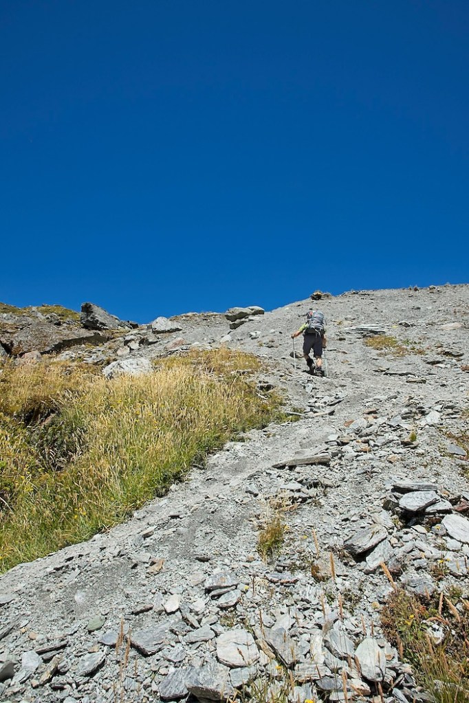 The last section up to Rees saddle is steep. Not long, but steep. It is basically climbing the cirque wall of what used to be a glacier. About 3/4 of the way up we saw the group of women that had come into the hut late the night before—they were catching up with us. As one got closer, I shouted down the her: