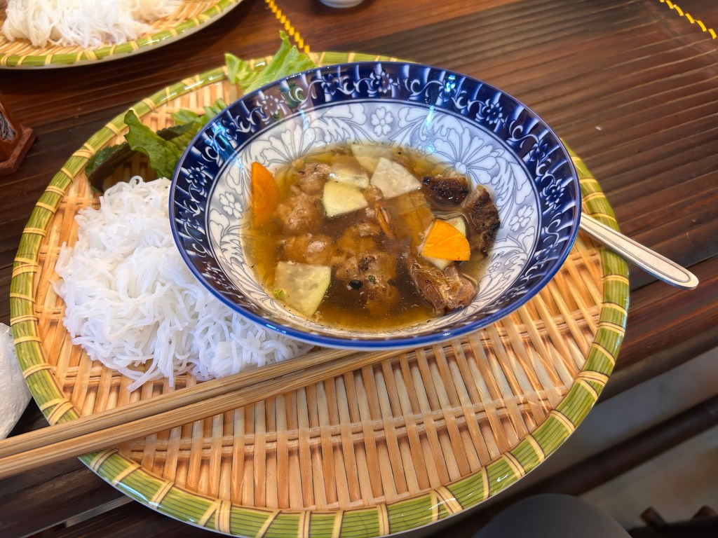 It is a popular Vietnamese dish originating from Hanoi that consists of grilled pork and rice vermicelli noodles. The noodles come on the side and you dip them into the broth. After partaking of some noodles and meat, you then, according to Long, eat a piece of the lettuce and herbs that come on the side. I made this dish once not knowing what it really was like. It came out nothing like this. Mine was “meh,” this was super tasty.
