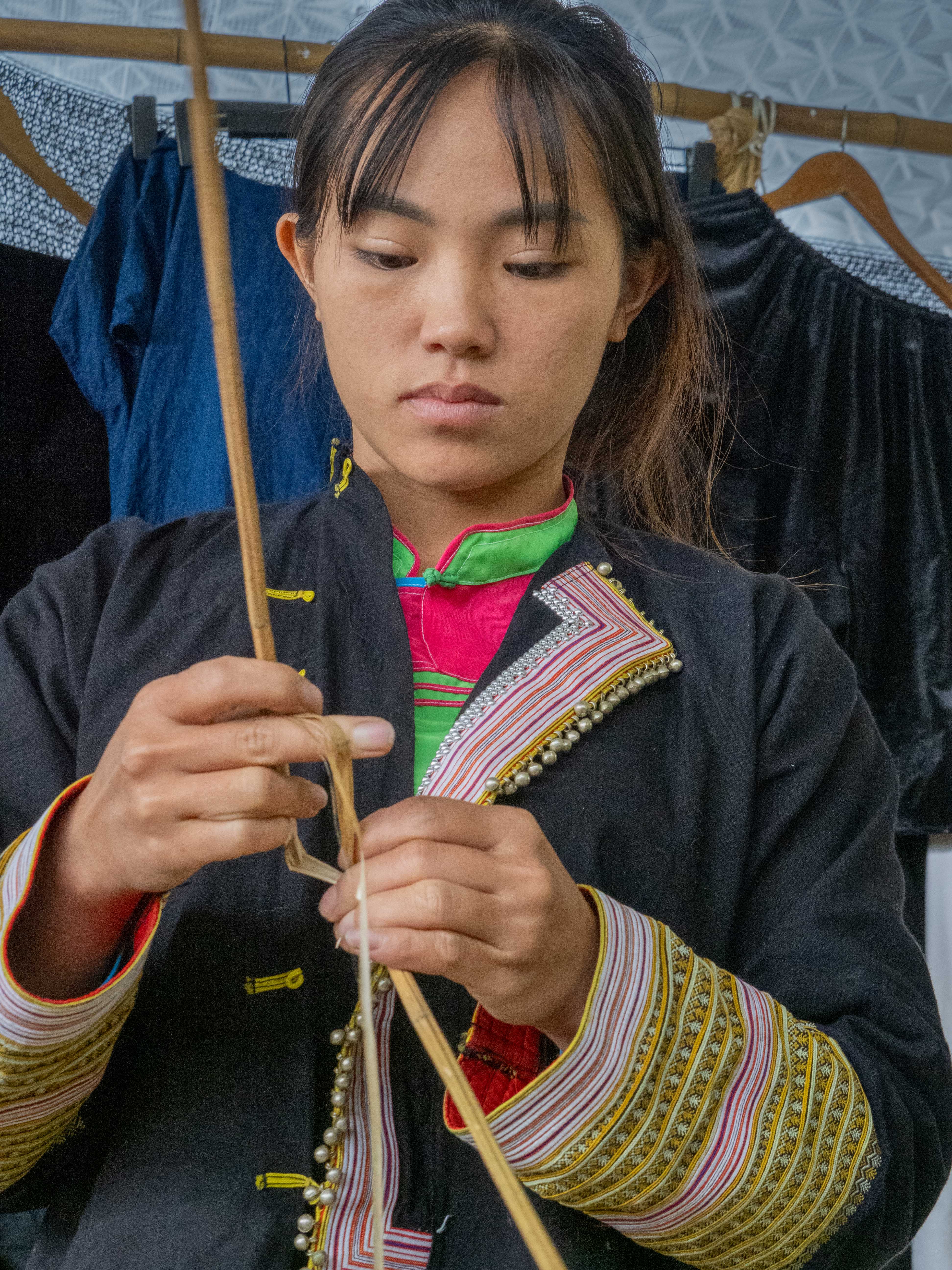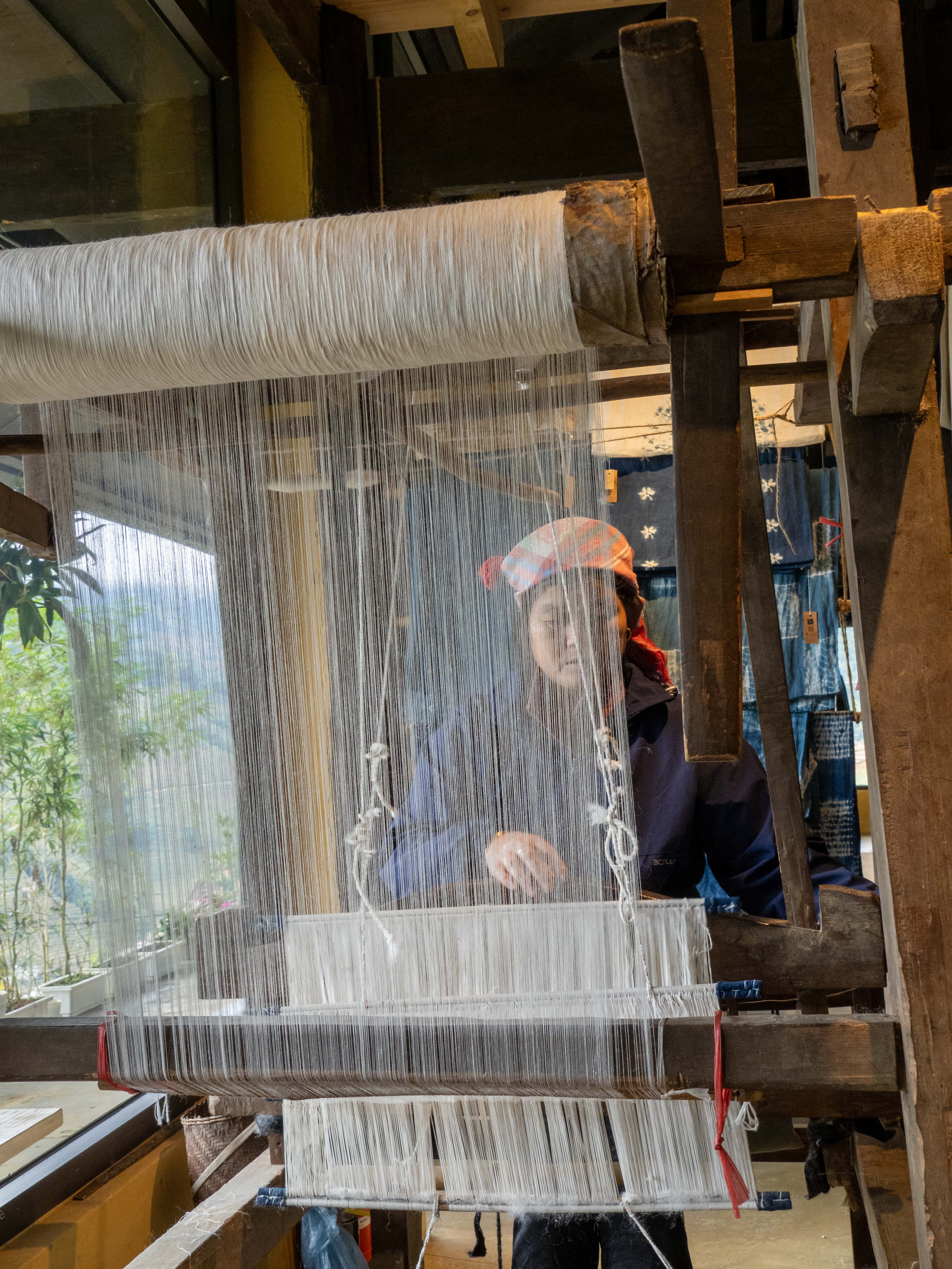 The Black Hmong are one of 5 tribes with the Hmong group. They are called this, evidently, because of the color of clothes they wore. At the higher altitudes around Sapa, the only dye they could make came from the indigo plant. After the shifting/chain debacle was resolved, we stopped in a place that made traditional Black Hmong clothing.