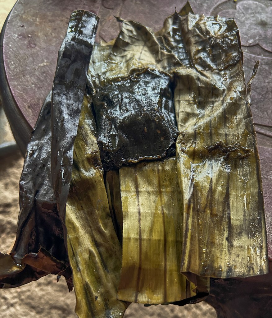 At one point in a small village, we stopped at a restaurant to have a drink and a bit of a snack. Thao was excited that they had a local specialty—sticky rice with banana and green mango wrapped in banana leaf. It looked pretty hideous, but I bit into it and it was wonderful.