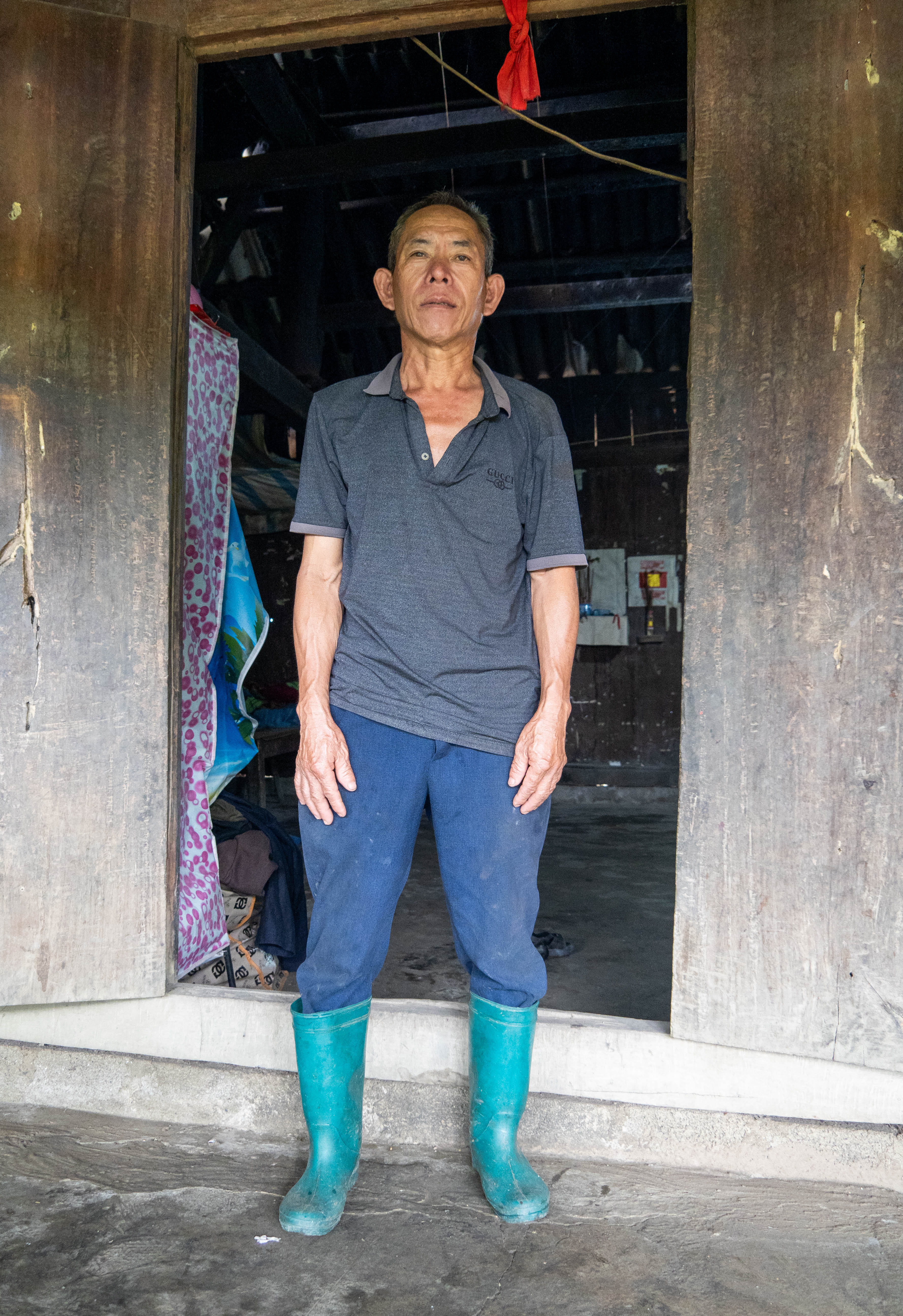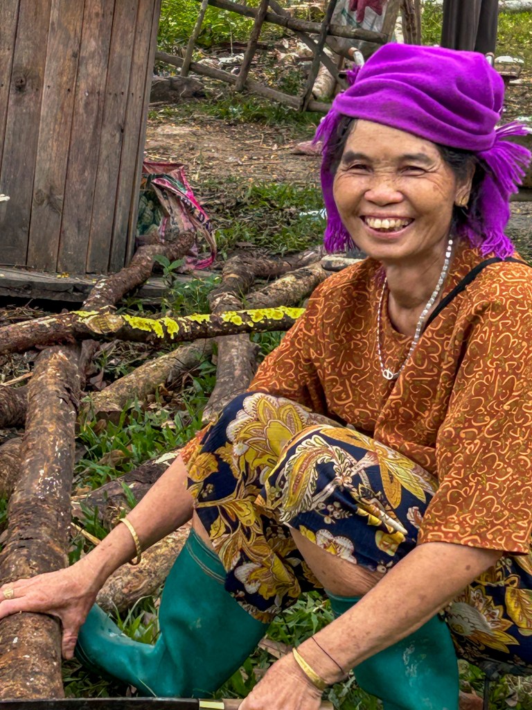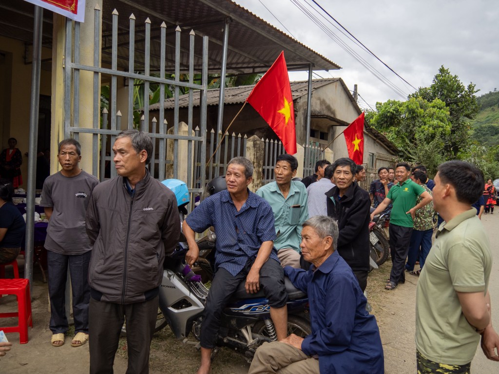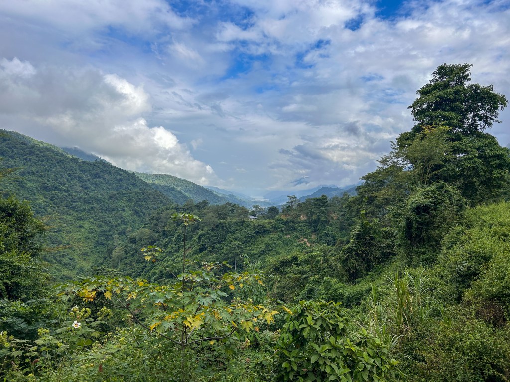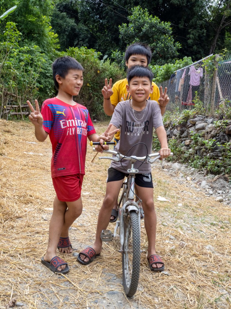 We started the descent down the first big climb. Thao pulled over and said we were going to go visit another local home. There was a tied-up dog barking pretty aggressively, so Thao shouted out and the man came out of the house. They chatted for a while and then he motioned for us to come with him.