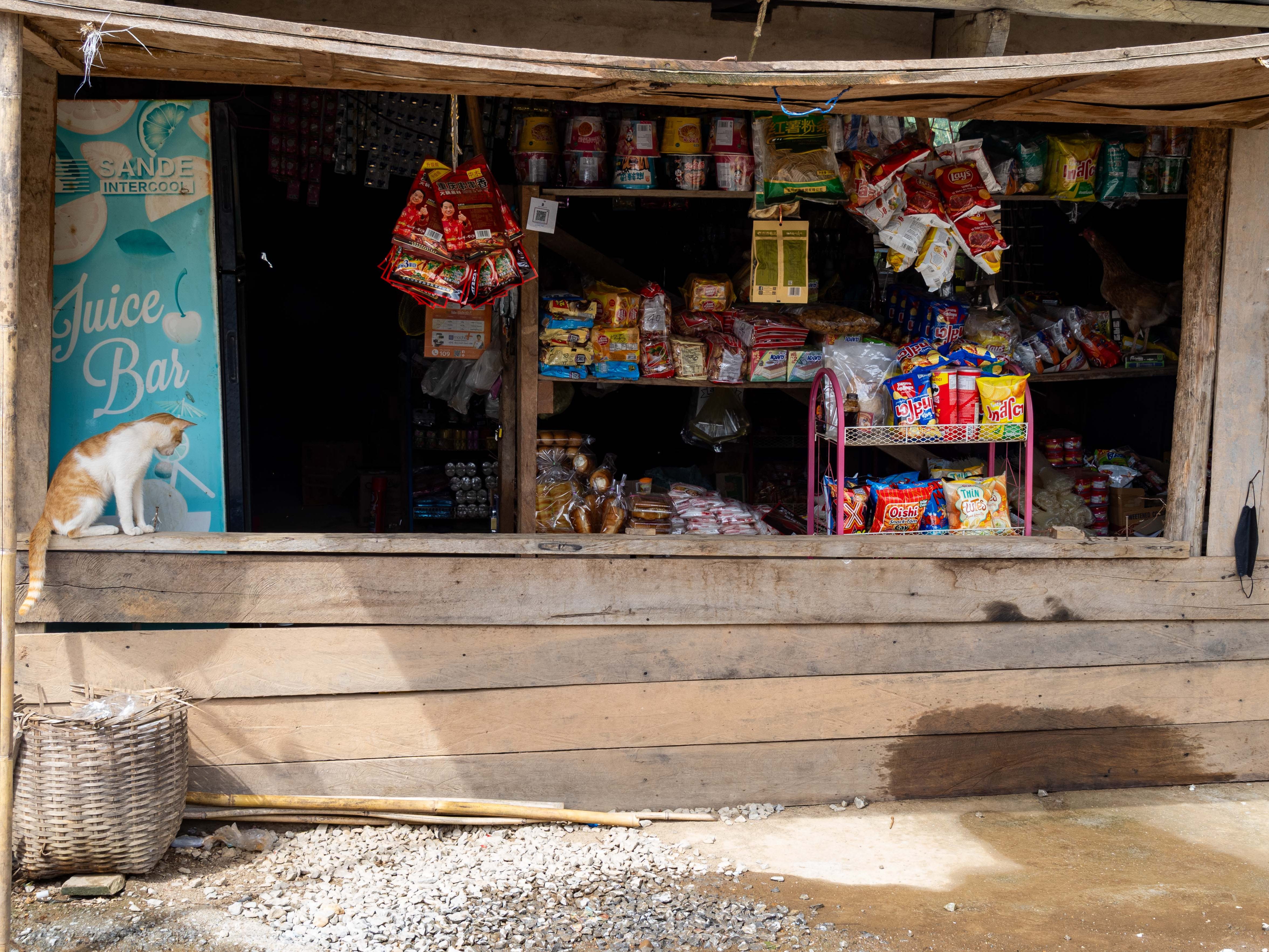 The village was small and bit run down and dirty. I am guessing it exists as a base for the people that work on the dam. There was a small store and a restaurant. In typical Lao fashion, there were no boundaries between the people and animals. Everybody wandered everywhere. If you click on the picture with the cat and look closely at the food shelves, you will see a chicken standing there on the second shelf.