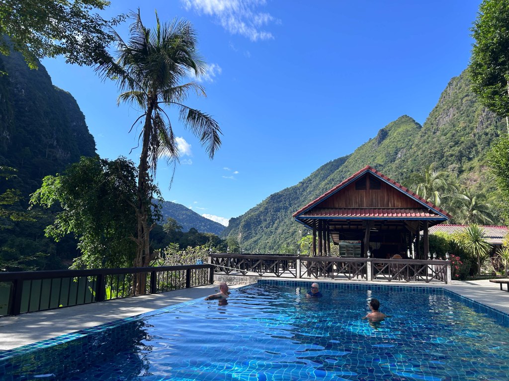 We headed back to the hotel, which was quite nice, especially because it had an amazing pool that overlooked the river. We cleaned ourselves up, got in the pool and reacquainted ourselves with Beerlao.