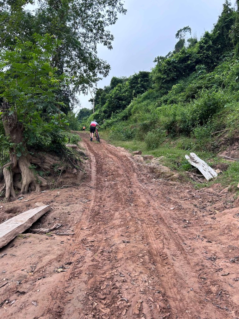 The journey started with a short boat ride down to a spot on the river where we joined the dirt track; the boat driver nearly missed it and Xue had to give a loud shout to get him to pull over in time. We unloaded our stuff and right out of the gate, it was a steep, muddy uphill to just get started.