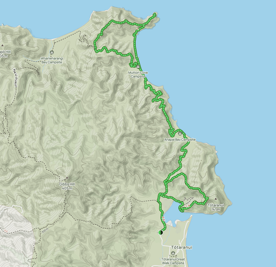 The map on the left shows the route where you don’t drop all of the way down to Whariwharangi, but there is a nice overlook down to the beach.